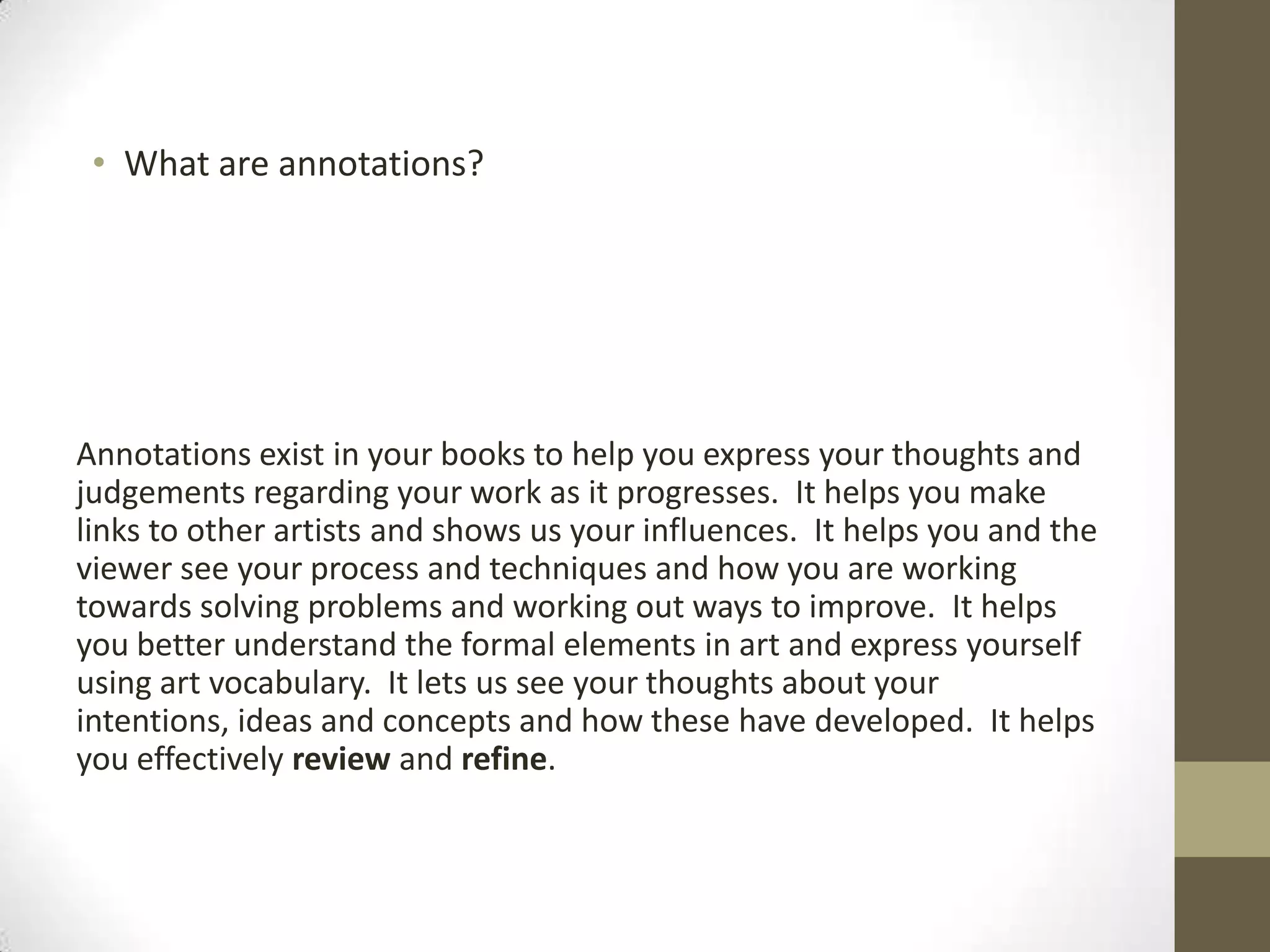 Annotations exist to help artists express their thoughts on their work, show influences, techniques, and how they are working to improve. Annotations should explain what was done, how ideas will develop, experiences, methods, choice of materials, how works fit a project, opinions on aspects, use of elements like composition and color, and potential improvements. Artists must use proper vocabulary covering elements like line, shape, texture, and principles like balance. Annotations should be reviewed to ensure all relevant topics are covered to develop understanding.