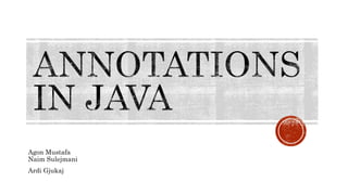 The document provides an overview of Java annotations, including their syntax, types, and common use cases. Annotations serve as metadata, influencing compiler behavior, documenting code, and affecting runtime behavior, with examples such as @deprecated and @suppresswarnings. It also discusses the creation of custom annotations and the use of annotation processors for code generation and validation.