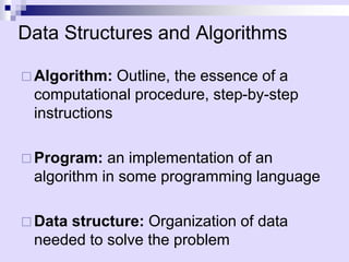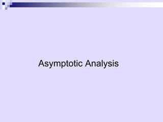 Asymptotic analysis allows the comparison of algorithms based on how their running time grows with input size rather than experimental testing. It involves analyzing an algorithm's pseudo-code to count primitive operations and expressing the running time using asymptotic notation like O(f(n)) which ignores constants. Common time complexities include constant O(1), logarithmic O(log n), linear O(n), quadratic O(n^2), and exponential O(2^n). Faster algorithms have lower asymptotic complexity.