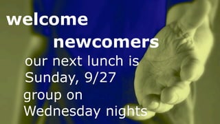 The document announces an upcoming church lunch on Sunday September 27th and weekly group meetings on Wednesday nights from 6:30-8:30pm at the church. It also advertises an event called ARISE on Saturday September 26th and mentions that small group signups will start in October in the church foyer.