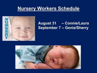 This document contains announcements for Spring River Assembly of God church. It provides the schedule for nursery and greeter workers for August 31st and September 7th. It announces a new sermon series beginning next Sunday on doing the mission that Jesus has given. It also includes information about joining the church, submitting prayer requests, signing up for text reminders, and downloading a Bible app.