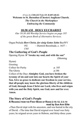 The document provides details of an upcoming Sunday service at St. Barnabas (Chester) Anglican Church located in Toronto, including the order of service, readings, hymns, and names of those participating. It also lists upcoming Bible study and concert events at the church and invites people to share their favorite hymns. The document aims to inform churchgoers and visitors about the upcoming Sunday service and life of the faith community.