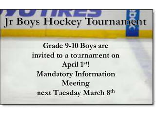 The document contains announcements about various school activities, including a $5 lunch special, a boys' baseball tournament information meeting, tryouts for the varsity baseball team, opportunities to sell daffodil pins and check the volunteer board, a meeting owed money for pizza, and visits from the health nurse.