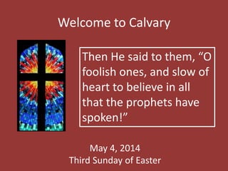 This document provides announcements and information for Calvary Lutheran Church. It includes details about upcoming services and events, such as Vacation Bible School in July and First Communion classes starting in June. It also provides updates on the church website and requests for volunteers. The document closes with prayer requests and notices about sharing photos from Easter season activities.
