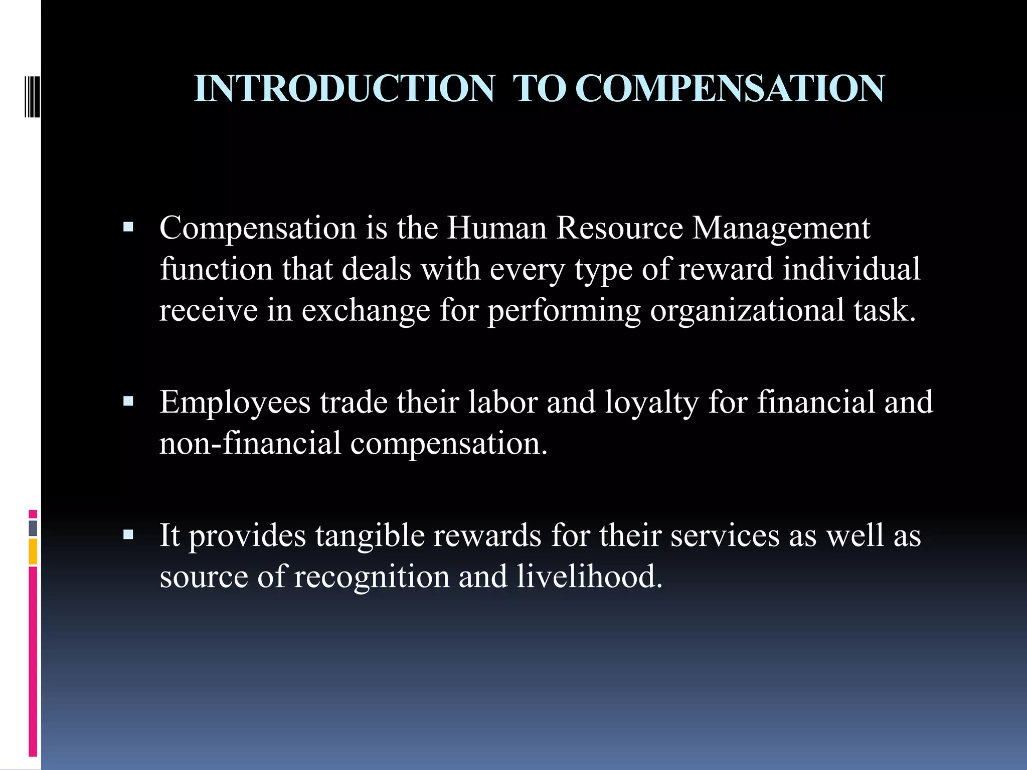 This document discusses compensation and the factors that influence it. Compensation includes both financial compensation like wages and salaries as well as non-financial compensation like benefits and recognition programs. It is determined based on both internal factors like ability to pay, job requirements, and employee performance as well as external factors like cost of living, labor market conditions, government regulations, and technological changes. The goal of compensation is to attract, motivate, and retain qualified employees in a fair and competitive way.