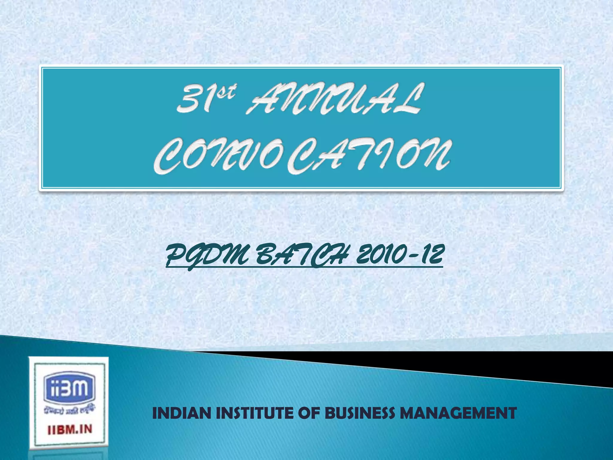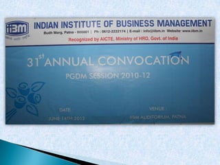 The Indian Institute of Business Management (IIBM) Patna held its 31st convocation for the PGDM batch of 2010-12 on June 14, 2012, awarding diplomas and recognizing top achievers. Col. J.K. Sinha secured the first position with 82%, followed by Neha Sinha and Rajeev Kumar, who received a gold, silver, and bronze medal respectively. The event featured notable speakers who emphasized the importance of education, moral values, and entrepreneurship for students' future success.