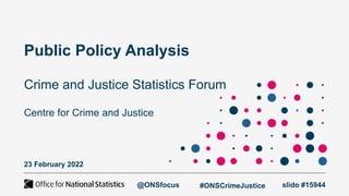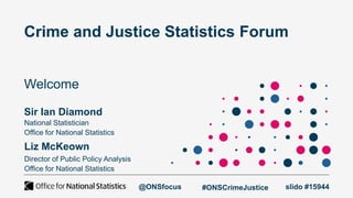 The document summarizes discussions from a crime and justice statistics forum held by the Office for National Statistics (ONS) on February 23, 2022. It includes an agenda with topics on measuring crime during the pandemic, workshops on crime survey data collection and the future of crime measurement. Several speakers presented on challenges of measuring crime during COVID-19 restrictions, including reduced in-person Crime Survey for England and Wales sample sizes, and impacts on trends in different types of crime. Administrative data from police and justice systems were also discussed as alternative data sources to understand crime during the pandemic.
