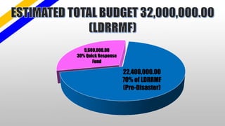 The document outlines proposed expenditures for disaster response and recovery projects amounting to PHP 9,600,000.00, along with various infrastructure improvements in high-risk areas such as construction of drainage canals, retaining walls, and an evacuation building. Additionally, it details funding allocation for evacuation equipment and personnel positions to enhance emergency response capabilities.