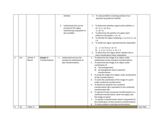This document provides the annual lesson plan for Form Five students at SMK Bukit Jelutong Shah Alam for 2012. It outlines 45 weeks of topics to be covered from January to September, including chapters on number bases, graphs, transformations, matrices, variations, probability, bearing, earth geometry, and plans/elevations. Key learning objectives and outcomes are specified for each topic. The schedule notes public holidays and exam periods.
