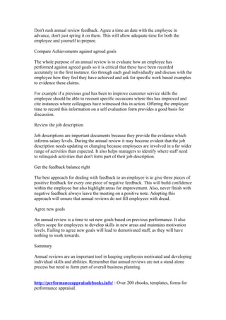 An annual performance review should be part of a wider goal-setting program tailored to individual employees. The review process includes encouraging self-assessment, providing an overview of the format, preparing well with feedback from colleagues, scheduling adequate time, comparing achievements to goals with examples, reviewing the job description, balancing positive and negative feedback, and agreeing on new goals. Done correctly, annual reviews can help motivate employees and develop skills.
