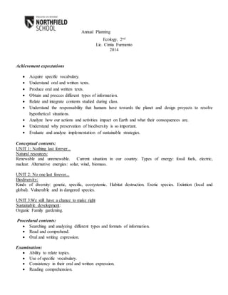This document outlines the annual plan for an Ecology class taught by Lic. Cintia Furmento. The plan includes expectations for student achievement such as acquiring vocabulary, understanding texts, producing oral and written work, and analyzing how human actions impact the Earth. It is divided into three units that will cover natural resources and energy, biodiversity, and sustainable development. Students will learn about renewable and nonrenewable resources, types of energy, threats to biodiversity like habitat destruction and invasive species, and examples of sustainable practices like organic family gardening. Assessment will focus on students' ability to relate topics, use technical vocabulary, and demonstrate comprehension through oral and written work.