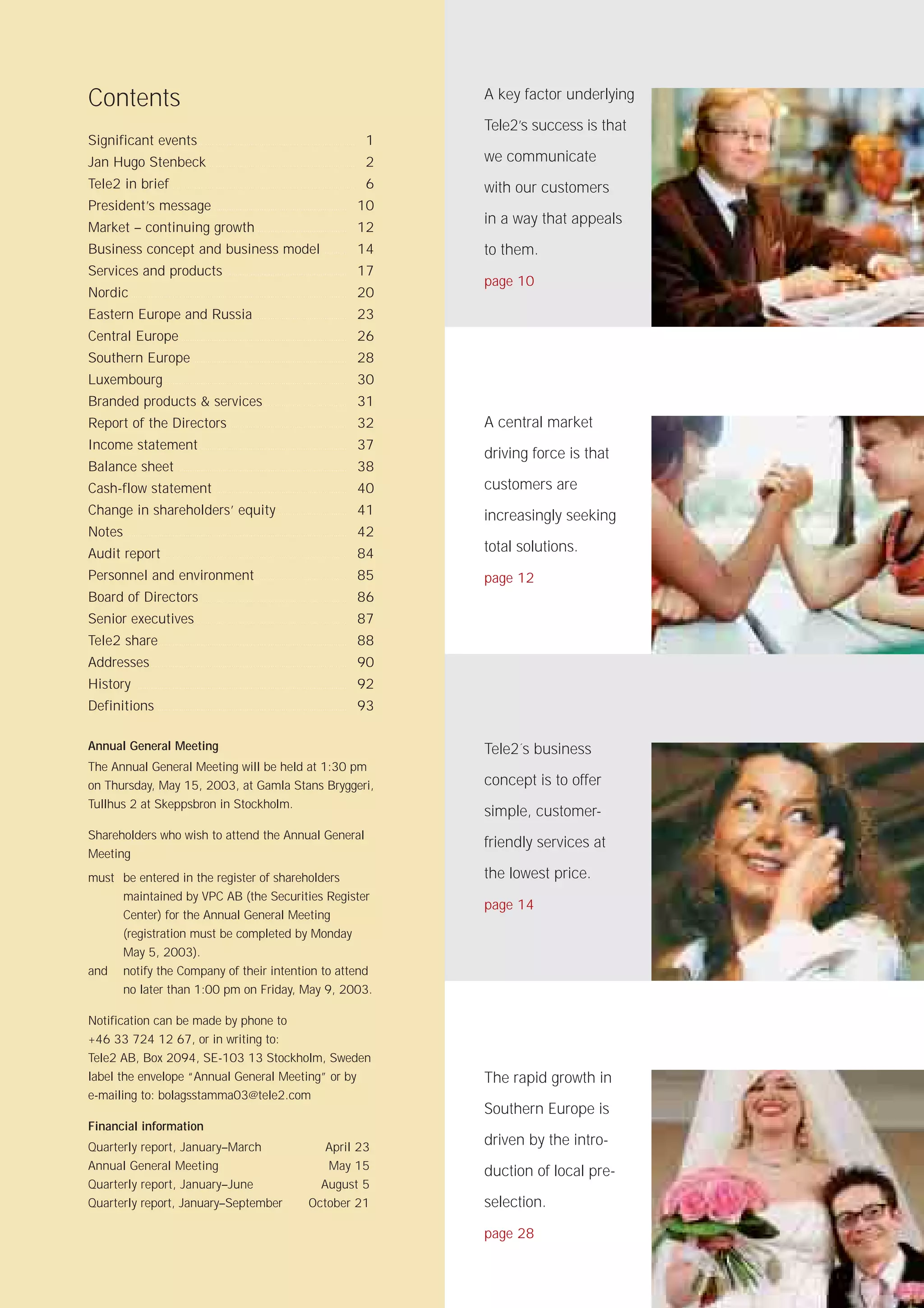 Tele2 is a leading alternative pan-European telecommunications company offering fixed and mobile telephony, internet, and data network services to over 16.8 million customers across 22 countries in Europe and Russia. In 2002, Tele2 saw significant growth and improved financial results, including a 25% increase in operating revenue to SEK 31.3 billion and positive EBITDA of SEK 5.1 billion compared to SEK 1.7 billion in 2001. Tele2 also ended the year with 16.8 million customers, an increase of 12% over 2001. At the beginning of 2003, Tele2 acquired the British company Alpha Telecom to further expand its business.
