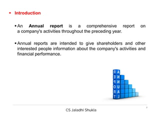 The document discusses key aspects of annual reports for companies. It defines an annual report as a comprehensive report on a company's activities in the preceding year, intended to give shareholders and other stakeholders information on the company's performance and financials. The document outlines the importance of annual reports, statutory provisions around their disclosure, typical contents including financial statements, directors' reports, auditors' reports, and considerations for writing and designing an effective annual report such as length, style, inclusion of photos and infographics.