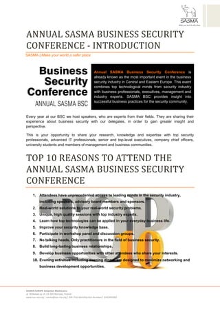 The document outlines the details of the annual SASMA Business Security Conference in Warsaw, Poland, which brings together security professionals and expert speakers to share insights and solutions for business security challenges. It highlights the benefits of attending, including networking opportunities and high-quality sessions, and provides information on registration, fees, and accommodations. The conference is scheduled for November 26-27, 2015, with various discounts available for early registrations and group bookings.