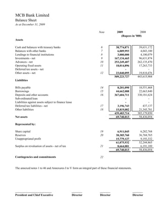 The document provides financial statements for MCB Bank Limited for the year ended December 31, 2009. It includes the balance sheet, profit and loss account, cash flow statement, statement of changes in equity, and statement of comprehensive income, along with accompanying notes. The balance sheet shows total assets of Rs. 509.2 billion and total liabilities of Rs. 439.5 billion. The profit and loss account reports a net profit after tax of Rs. 15.5 billion for 2009.