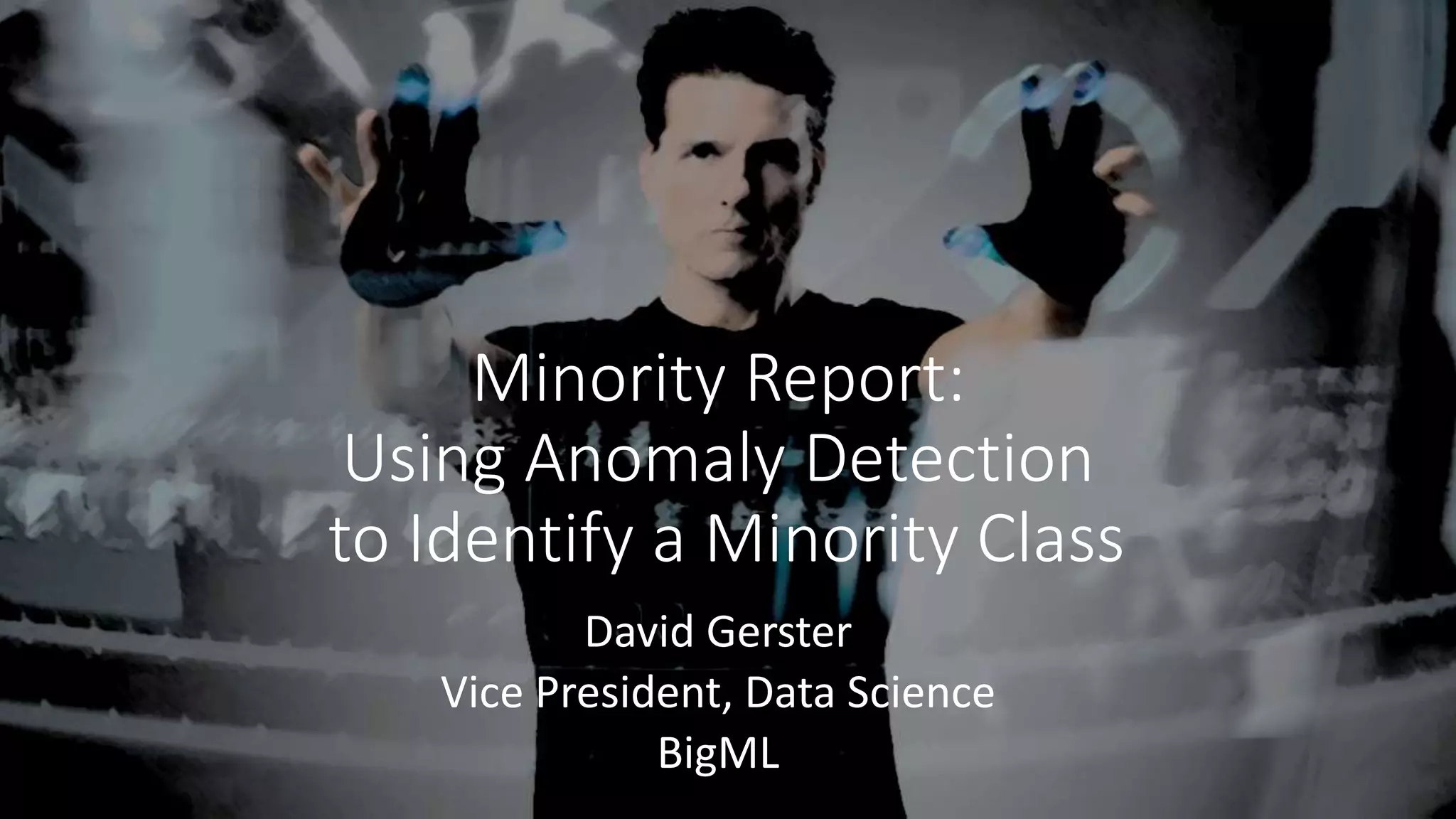 This document discusses using anomaly detection techniques to identify minority classes without labels. It summarizes using anomaly detection on an unlabeled cancer biopsy dataset to identify malignant biopsies as anomalies without knowing their labels. This "minority report" approach is well-suited for large unlabeled datasets where an adversarial minority class is expected, like credit card fraud or network intrusions, as it can identify outliers without predefined labels of what to look for.