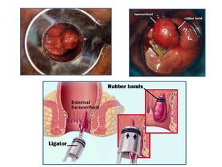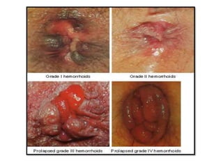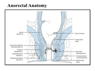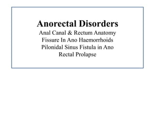 The document provides detailed information on various anorectal disorders, including their anatomy, definitions, pathogenesis, clinical features, diagnostic methods, and management strategies for conditions such as hemorrhoids, anal fissures, pilonidal sinus, perianal abscess, and fistula in ano. It describes the risk factors, classification, and specific treatments for each condition, highlighting the importance of clinical assessment and tailored management plans. Various conservative and surgical interventions for different grades of hemorrhoids and anal fissures are emphasized, along with potential complications associated with these disorders.