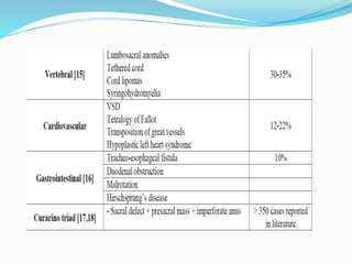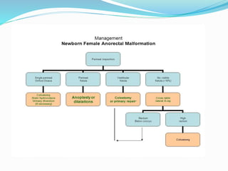 This document discusses anorectal malformations, which are anomalies of the anorectal system, urogenital system, sacral spine, and perineal musculature. It describes the embryological development of the hindgut and cloaca. Various classifications of anorectal malformations are presented, including the Wingspread, Pena, Krickenbeck, and anatomic classifications. Associated anomalies are discussed. The document outlines the approach to examining and investigating a newborn with an anorectal malformation, including history, physical exam, and imaging studies. It discusses early management decisions and various surgical procedures for treating anorectal malformations.