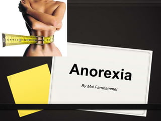 Anorexia is an eating disorder characterized by an obsessive desire to lose weight by refusing to eat. There are two main types - binge/purging anorexia where people force vomiting after eating, and restrictive anorexia where people severely limit food intake. Health risks of anorexia include heart failure, low blood pressure, osteoporosis, and death. Up to 24 million people in the US suffer from eating disorders, most between ages 12-25, and 15% die due to suicide or starvation.