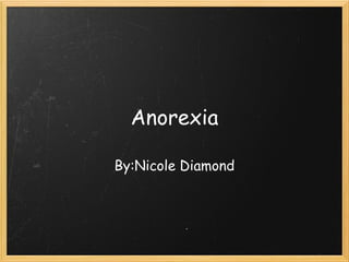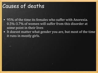Anorexia is an eating disorder that primarily affects females, with 0.5-3.7% of women experiencing it at some point in their lives. It is caused by factors like negative comments about weight from others that lower self-esteem, and sometimes begins with a history of underfeeding as an infant. Signs include weight loss, wearing loose clothes, skipping meals, hair loss, fatigue, and menstrual changes in women. Anorexia is difficult to diagnose initially as those suffering deny the problem, but medical issues eventually reveal it. Treatment involves supervised weight gain through feeding tubes, as well as psychological counseling to address underlying issues and change perceptions of body image. Anorexia has one of the highest mortality rates of