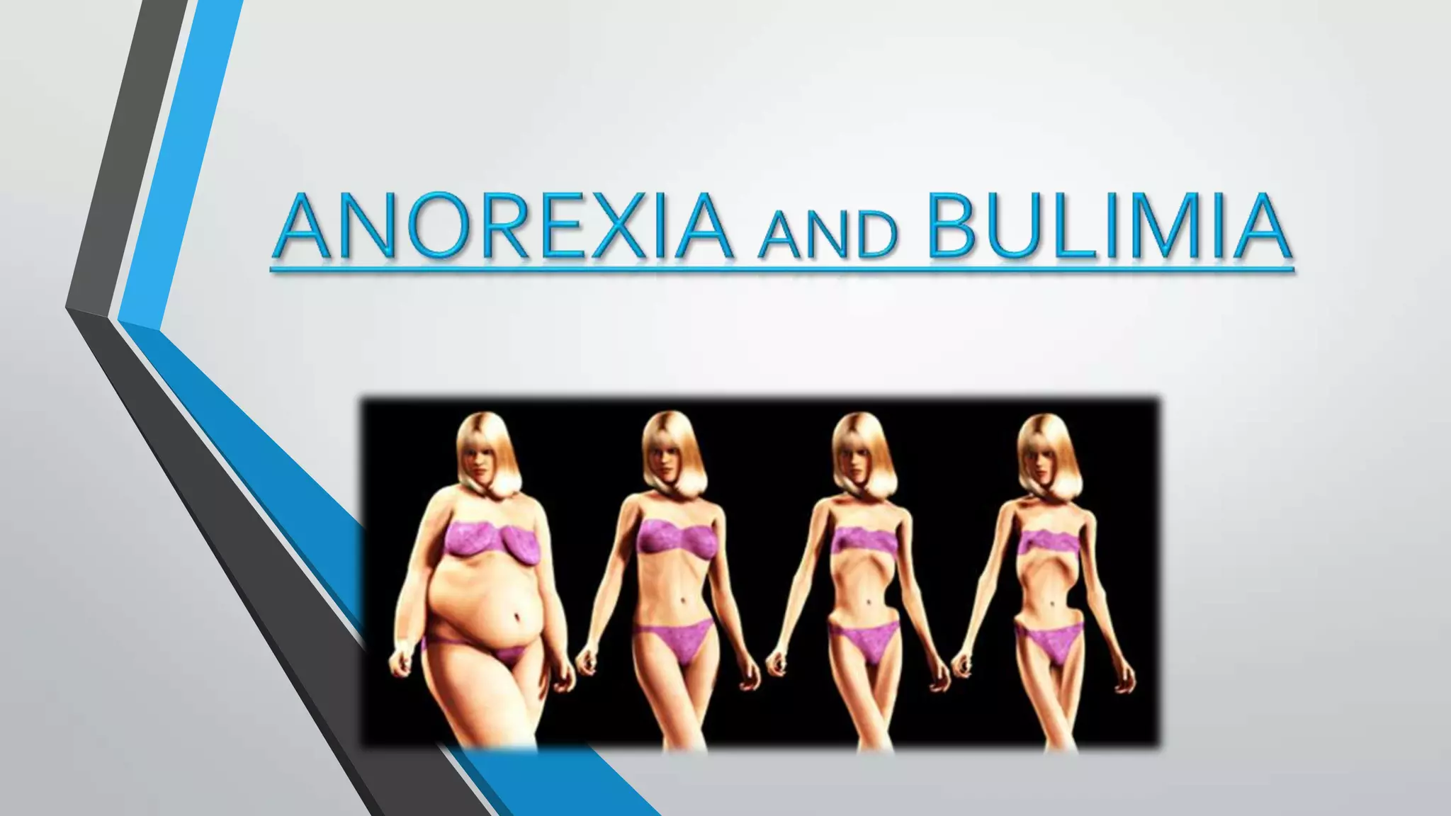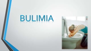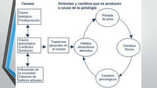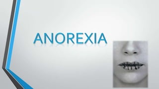 This document summarizes information about anorexia and bulimia. It defines anorexia as a psychological and physical disorder characterized by extreme weight loss from self-imposed starvation and a distorted body image. The causes of anorexia include socio-cultural factors and unrealistic beauty ideals. Symptoms include an obsessive fear of weight gain and physical complications like fainting and brittle nails. Treatment focuses on changing eating habits, weight monitoring, and psychological therapy. Bulimia is defined as a disorder involving binge eating followed by purging through vomiting or laxatives. It is more common in teenage girls and young women. Causes relate to biological, psychological, and social factors. Symptoms include binge eating in