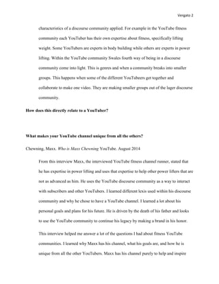 The document summarizes John Swales' article on discourse communities and applies its concepts to the YouTube fitness community. It discusses the six characteristics of a discourse community according to Swales: shared goals, intercommunication, participation, genres, lexis, and expertise. The document then analyzes how these characteristics apply to YouTube fitness channels and their subscribers. It explores how these channels help their followers and the effect of the YouTube fitness community through interviews and gym observations.