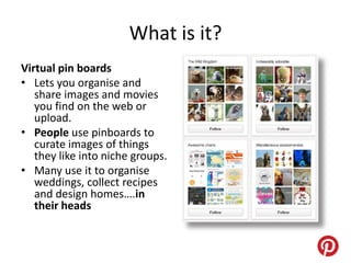 This document provides an overview of Pinterest and how it can be used for B2B marketing. Pinterest allows users to curate images and videos into boards on specific topics. While traditionally used more by women for things like home design, crafts and fashion, some big brands have started using it successfully to showcase their products and culture. For B2B companies, it's important to post high-quality, inspiring visual content that represents the brand rather than just advertising products. Pinterest users enjoy discovering new topics through others' boards, so content should allow people to find a company interesting rather than directly pushing messages.