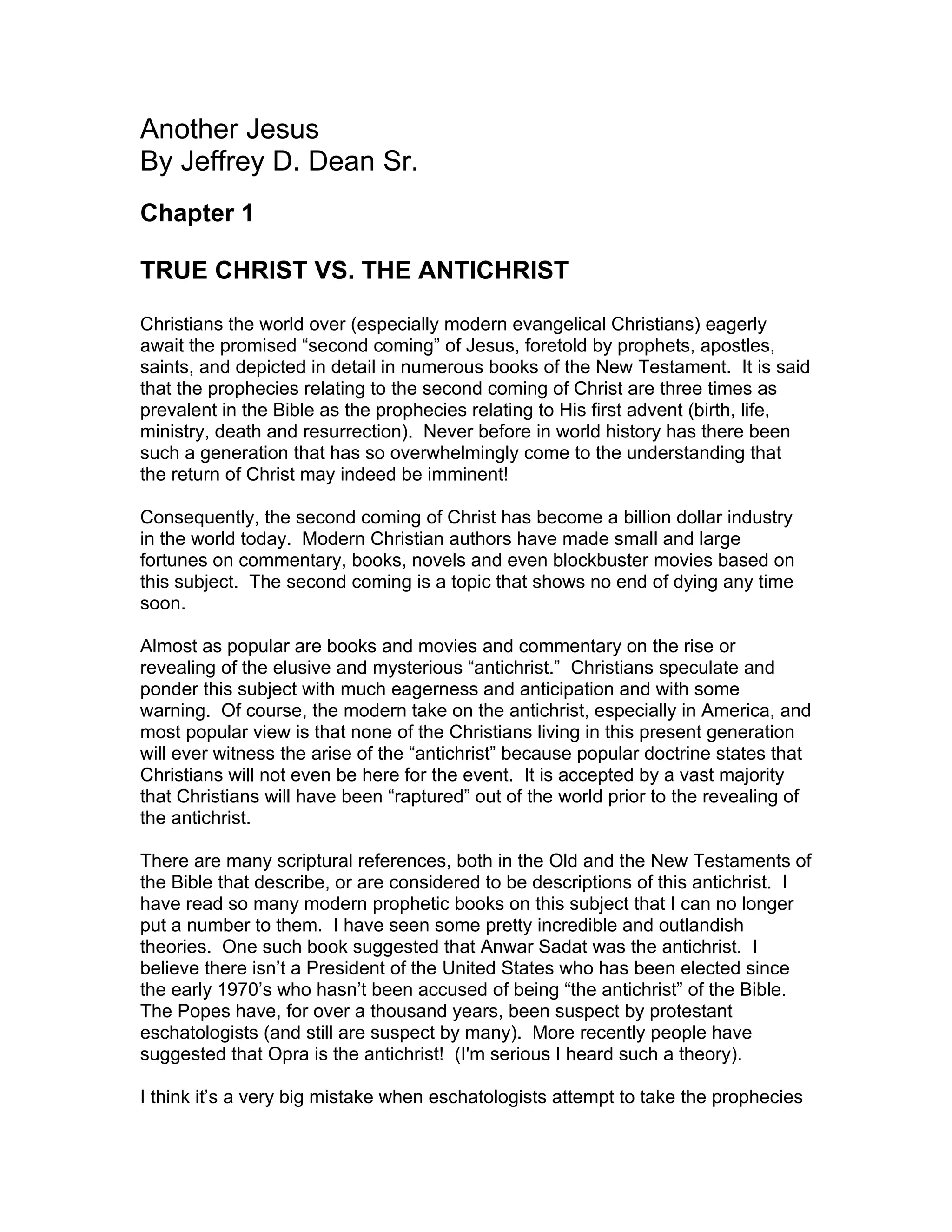 In 'Another Jesus' by Jeffrey D. Dean Sr., the author discusses the anticipation surrounding the second coming of Christ and the concept of the antichrist, emphasizing that modern interpretations often misinterpret scriptural prophecies. He argues against the prevalent view that contemporary Christians will not witness the antichrist and warns against the proliferation of false teachings that may emerge as society's understanding of Christ becomes twisted. Throughout, Dean stresses the importance of adhering strictly to biblical scripture in understanding end times prophecies rather than speculating based on current events or figures.