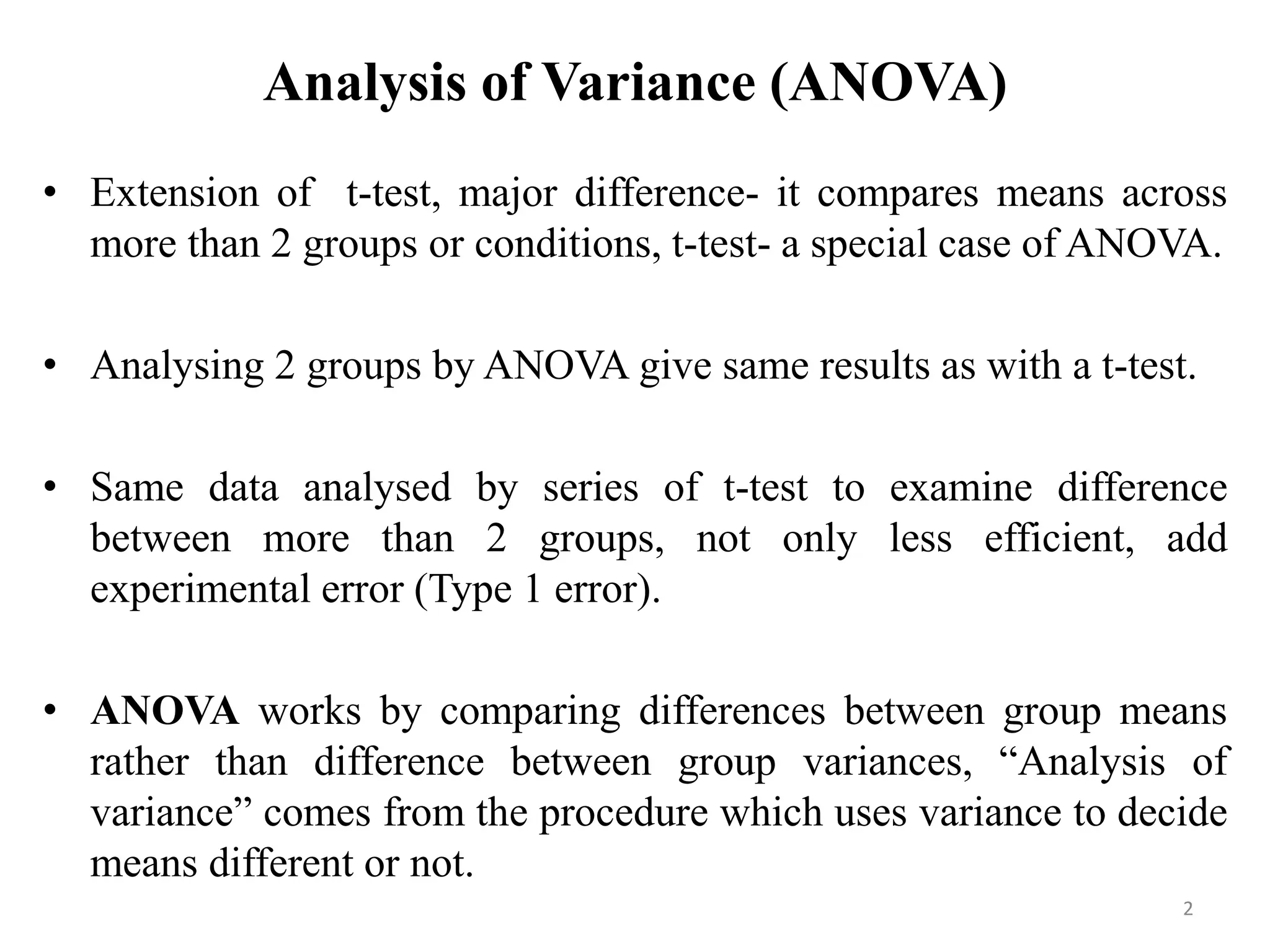 This document provides an overview of analysis of variance (ANOVA). It discusses how ANOVA compares mean differences across more than two groups, extending the t-test. It compares variations between and within groups to determine if mean differences are statistically significant. The document outlines different types of ANOVA including one-way ANOVA for a single independent variable, multifactor ANOVA for multiple independent variables, and MANOVA for multiple dependent variables. It provides an example calculation and analysis of a one-way ANOVA comparing three treatment groups.