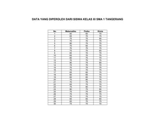 ANOVA digunakan untuk menganalisis perbedaan rata-rata antara tiga kelompok (Matematika, Fisika, Kimia) berdasarkan data nilai siswa kelas XI SMA 1 Tangerang. Hasil analisis menunjukkan ada perbedaan rata-rata antara kelompok Matematika dan Kimia berdasarkan nilai signifikansi yang lebih kecil dari taraf signifikasi.