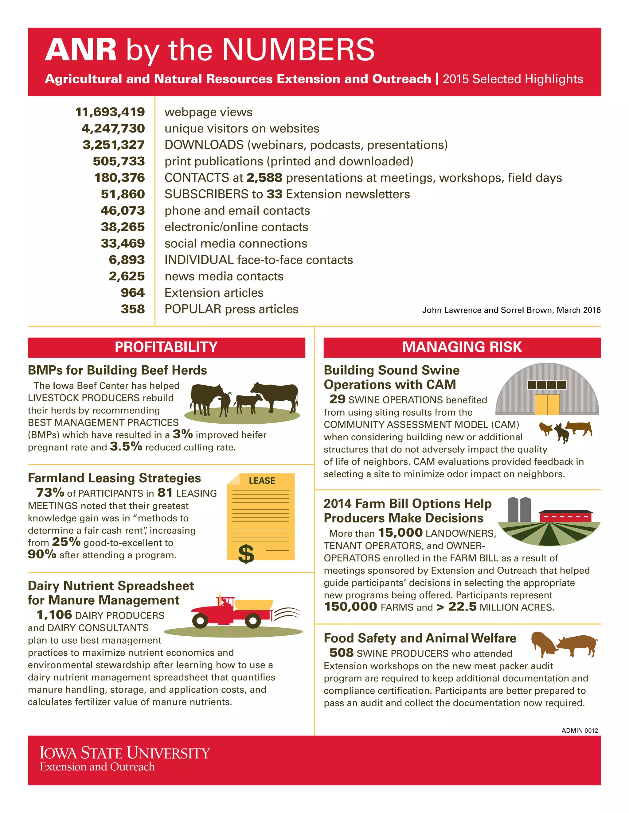 The document highlights key achievements of Iowa State University Extension and Outreach's agricultural and natural resources initiatives in 2015, including significant web engagement and educational outreach to farmers. It reports improvements in farm management practices and economic outcomes, such as better herd performance and increased adoption of nutrient management strategies among producers. Additionally, the extension services facilitated various programs to enhance food safety, bio-security, and sustainable practices within Iowa's agricultural community.