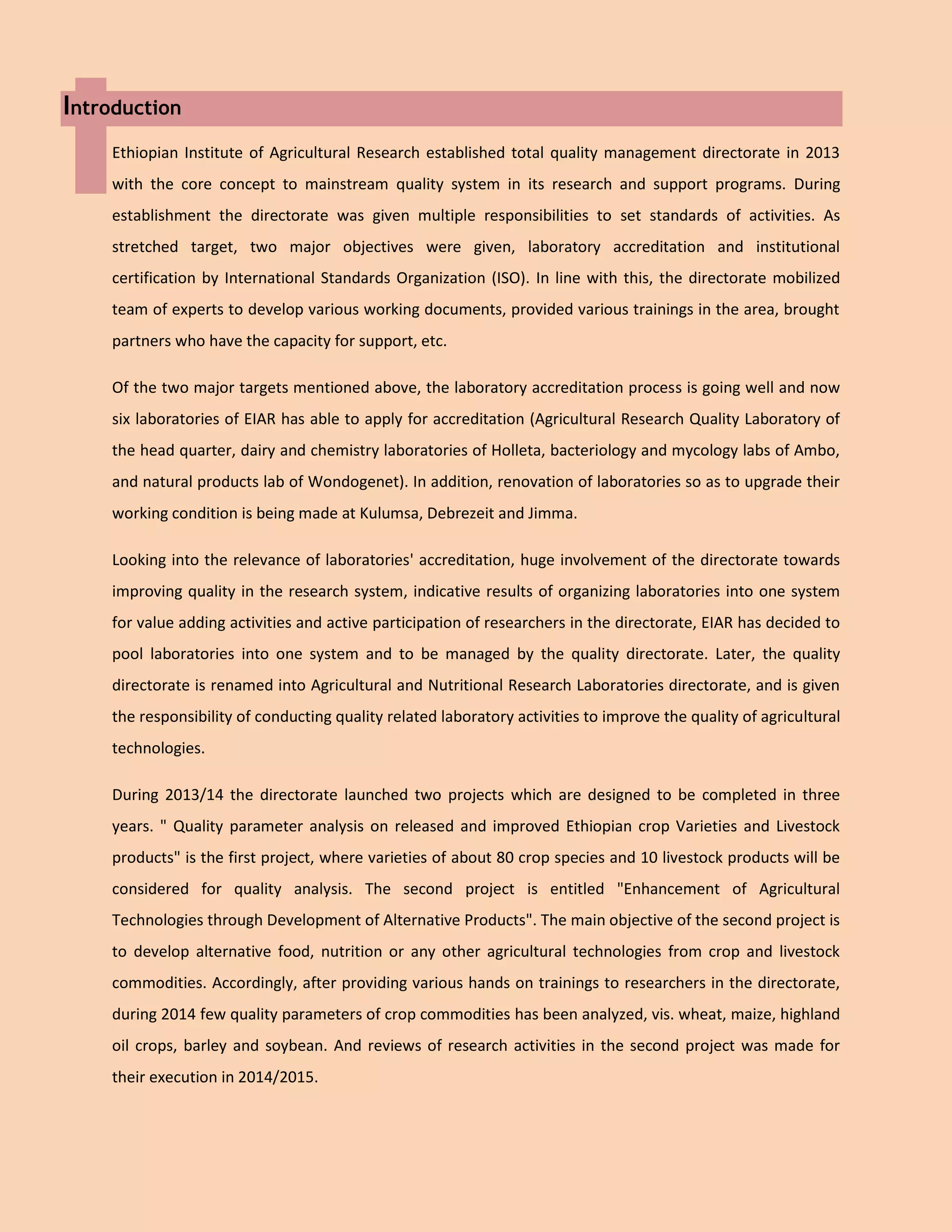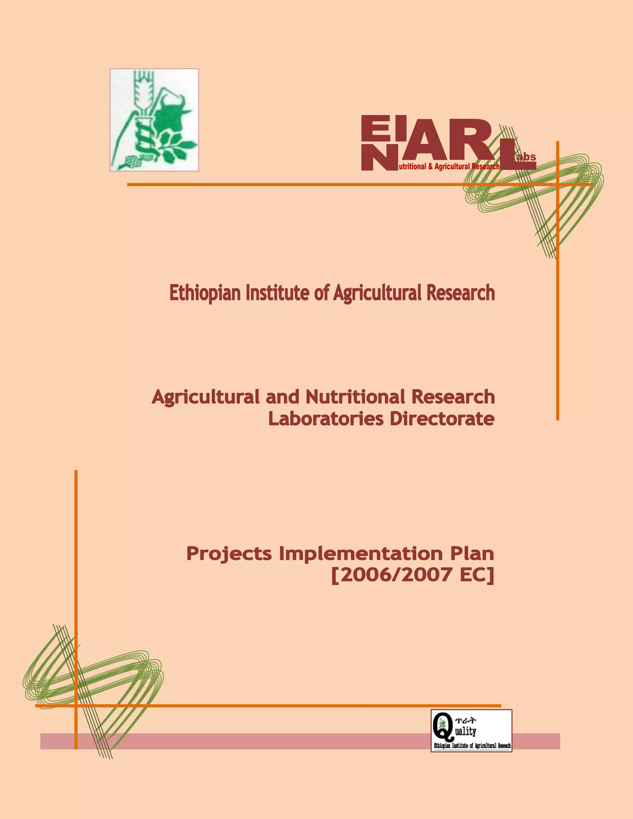 The Ethiopian Institute of Agricultural Research established a quality directorate in 2013 to improve quality systems in its research programs. The directorate has been working to accredit laboratories and certify the institution. Six laboratories have applied for accreditation so far. The directorate has also been upgrading laboratory facilities. It has launched two research projects on quality analysis of crops/livestock and developing alternative food products. The directorate oversees 105 researchers and laboratory assistants across 13 centers. It aims to improve knowledge sharing between experienced laboratory assistants and newer researchers. The document provides details on planned activities and budgets for researchers in the directorate's projects.