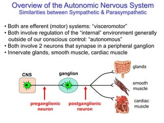 The autonomic nervous system consists of the sympathetic and parasympathetic divisions. The sympathetic division is responsible for the "fight or flight" response and uses norepinephrine as its neurotransmitter. Its preganglionic neurons originate in the spinal cord and project to peripheral ganglia. The parasympathetic division is responsible for "rest and digest" functions and uses acetylcholine as its neurotransmitter. Its preganglionic neurons originate in the brainstem and sacral spinal cord and project to ganglia near target organs. Both divisions regulate involuntary functions like heart rate and gland secretion.
