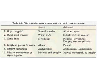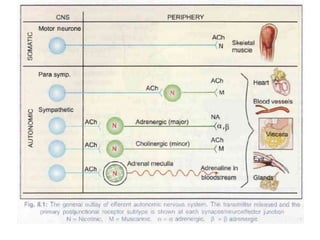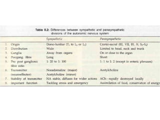 The autonomic nervous system functions below consciousness to control visceral functions like the heart and digestive system. It transmits messages via neurohumoral transmission where nerves release chemical messengers called neurotransmitters at synapses. This involves nerve impulses triggering neurotransmitter release from synaptic vesicles, binding to and activating receptors, and termination of the neurotransmitter through reuptake or degradation. Neurotransmitters can have excitatory or inhibitory effects depending if they cause depolarization or hyperpolarization of the post-synaptic membrane.