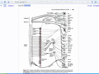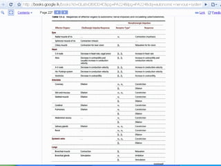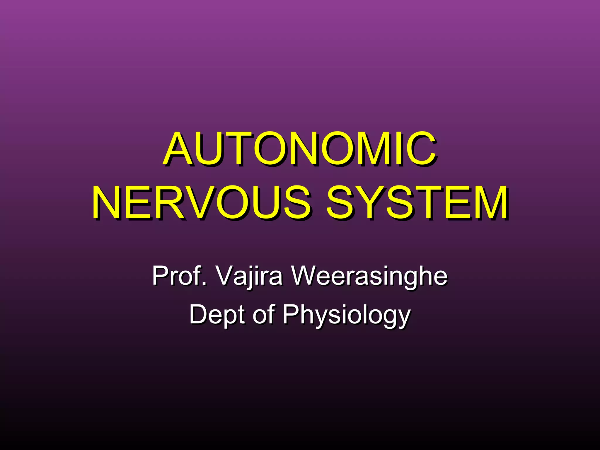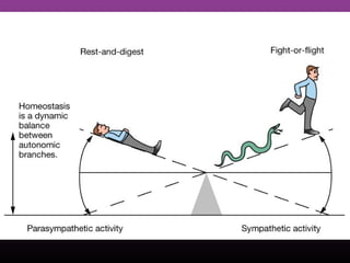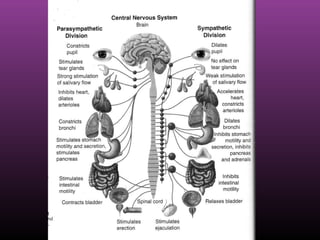 The autonomic nervous system regulates involuntary body functions and is divided into the sympathetic and parasympathetic nervous systems. The sympathetic system activates the body's fight or flight response and increases heart rate and respiration. The parasympathetic system calms the body and increases digestion. Both systems generally have opposing effects on organs with the sympathetic usually stimulating functions and the parasympathetic inhibiting them. Acetylcholine and norepinephrine act as neurotransmitters depending on the type of receptor in the target organ.