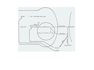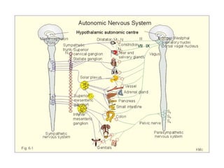 The document discusses the autonomic nervous system and autonomic drugs. It describes the parasympathetic nervous system in detail. The parasympathetic nervous system uses acetylcholine as its neurotransmitter and has effects such as reducing heart rate and blood pressure and facilitating digestion. Drugs that act on the parasympathetic nervous system are cholinergic agents, which mimic acetylcholine, and anticholinergic agents, which block acetylcholine's effects. Cholinergic drugs include acetylcholine and are used to treat conditions like Alzheimer's disease and glaucoma. Anticholinergic drugs have opposite effects and are used to treat cholinergic intoxication.