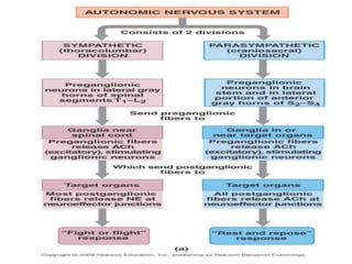 The peripheral nervous system consists of the spinal nerves, cranial nerves, autonomic nervous system, and peripheral nerve fibers. The autonomic nervous system is further divided into the sympathetic and parasympathetic nervous systems which generally have opposing effects on target organs. The sympathetic nervous system is responsible for the "fight or flight" response and mobilizes the body during stress through thoracolumbar outflow. The parasympathetic nervous system is responsible for "rest and digest" functions through craniosacral outflow.