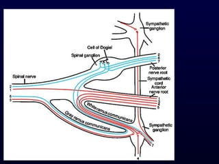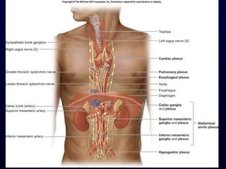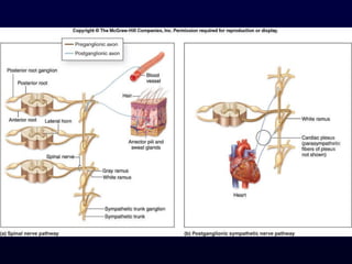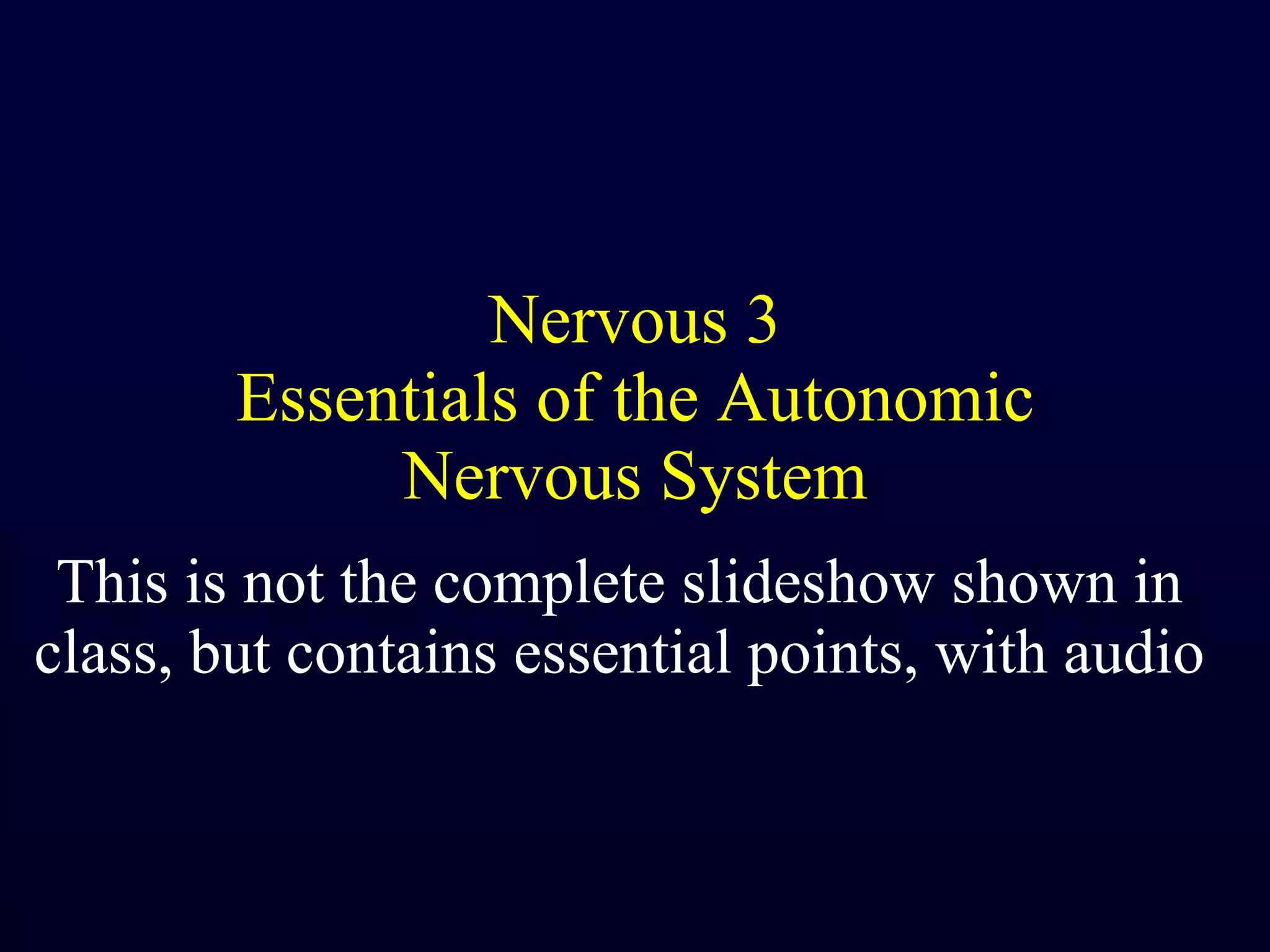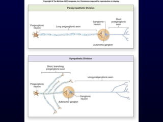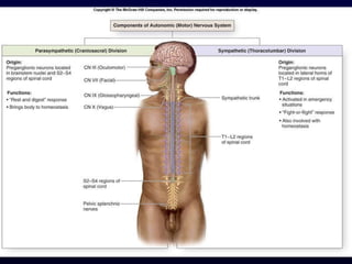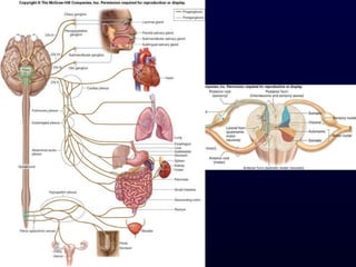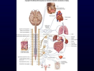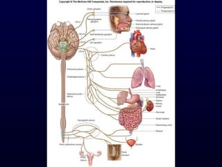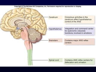 The autonomic nervous system (ANS) controls involuntary body functions like heart rate, digestion, respiration, and more. It has two divisions - the sympathetic and parasympathetic divisions. The sympathetic division is associated with the "fight or flight" response and increases heart rate and breathing. The parasympathetic division is associated with "rest and digest" and decreases heart rate and increases digestion. The ANS is controlled by the hypothalamus and brainstem regions of the central nervous system.