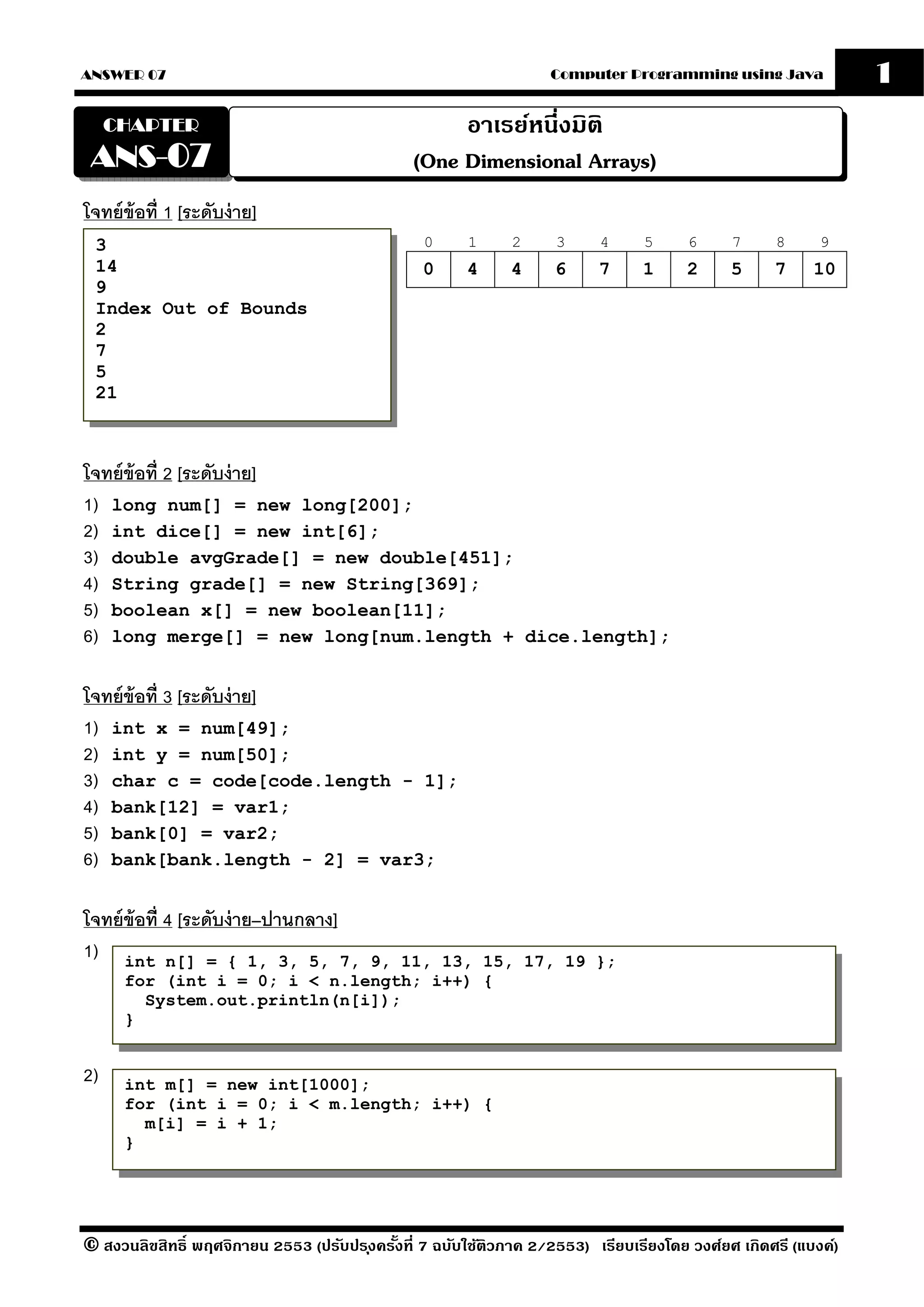 Computer Programming using Java 1 CHAPTER อาเรย์หนึ่งมิติ ANS-07 (One Dimensional Arrays) โจทย์ ข้อที่ 1 [ระดับง่ าย] 3 0 1 2 3 4 5 6 7 8 9 14 0 4 4 6 7 1 2 5 7 10 9 Index Out of Bounds 2 7 5 21 โจทย์ ข้อที่ 2 [ระดับง่ าย] 1) long num[] = new long[200]; 2) int dice[] = new int[6]; 3) double avgGrade[] = new double[451]; 4) String grade[] = new String[369]; 5) boolean x[] = new boolean[11]; 6) long merge[] = new long[num.length + dice.length]; โจทย์ ข้อที่ 3 [ระดับง่ าย] 1) int x = num[49]; 2) int y = num[50]; 3) char c = code[code.length - 1]; 4) bank[12] = var1; 5) bank[0] = var2; 6) bank[bank.length - 2] = var3; โจทย์ ข้อที่ 4 [ระดับง่ าย–ปานกลาง] 1) int n[] = { 1, 3, 5, 7, 9, 11, 13, 15, 17, 19 }; for (int i = 0; i < n.length; i++) { System.out.println(n[i]); } 2) int m[] = new int[1000]; for (int i = 0; i < m.length; i++) { m[i] = i + 1; } © สงวนลิขสิทธิ์ พฤศจิกายน 2553 (ปรับปร ุงครังที่ 7 ฉบับใช้ติวภาค 2/2553) เรียบเรียงโดย วงศ์ยศ เกิดศรี (แบงค์) ้