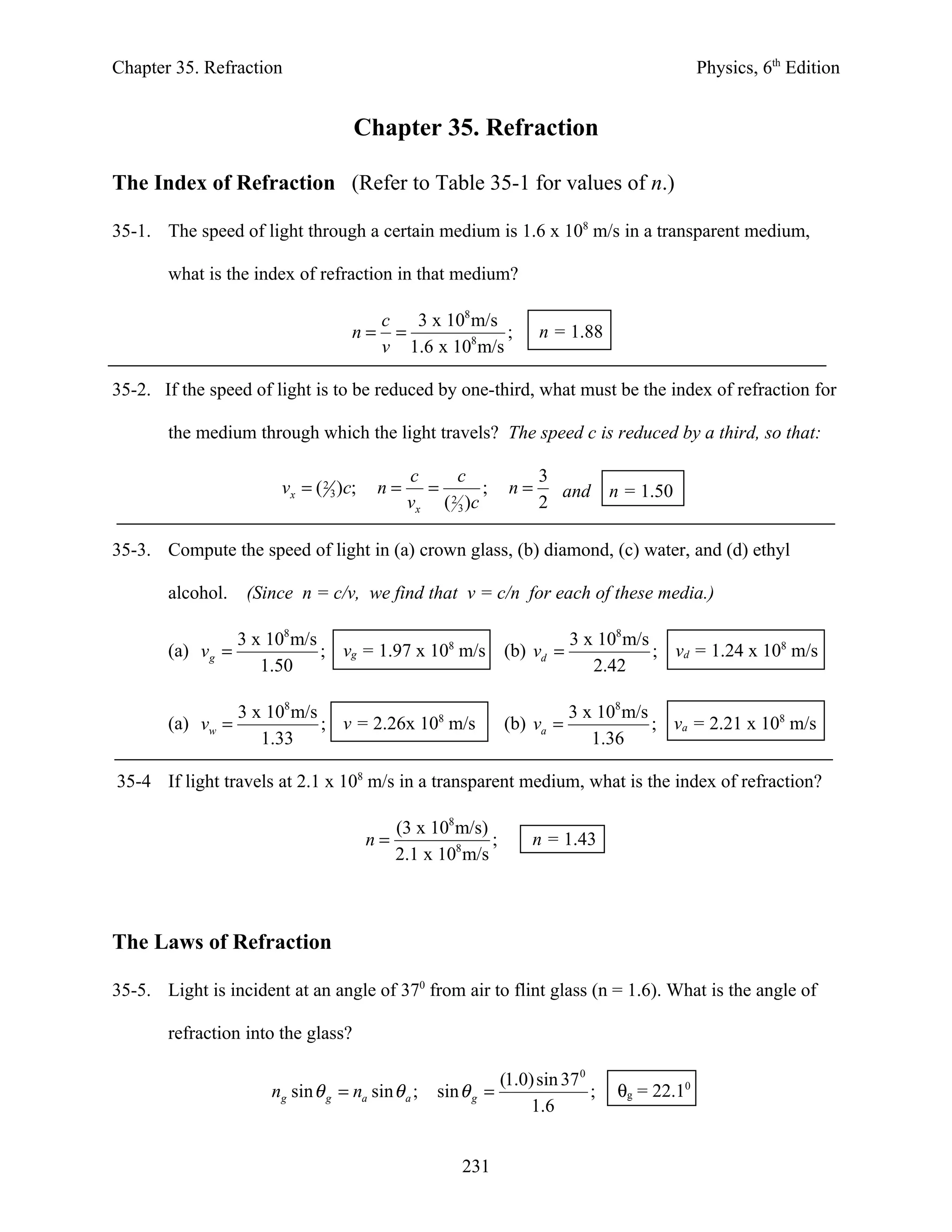 Several example problems are worked through applying these concepts to compute angles, indices of refraction, wavelengths and speeds of light in various materials.