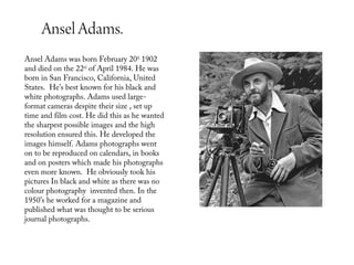 This document provides information about the American photographer Ansel Adams (1902-1984), known for his black and white landscape photographs of the American West. It discusses Adams' use of large format cameras to capture high resolution images, his development of prints himself, and the popularity of his work in books and posters. It also examines some of Adams' most famous photographs, his influences including Alfred Stieglitz and Robert Dawson, his compositional style of including both near and far elements, and strengths in capturing interesting details through contrast and shadows.