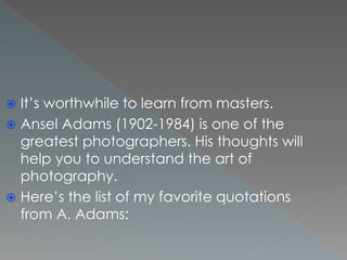 The document discusses key quotes from Ansel Adams, one of the greatest photographers, emphasizing the art of photography and the creative process involved. It highlights the importance of personal expression, understanding photography beyond mere technique, and cultivating a meaningful connection with viewers. Additionally, it reassures photographers that having a limited number of significant images per year is acceptable and encourages continuous practice and dedication.