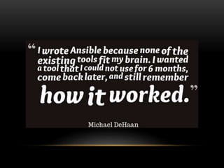 This document summarizes an Ansible meetup presentation about what Ansible is, why it is useful, and how it works. Ansible is an open source automation tool that configures systems and deploys applications using human-readable YAML files called playbooks. It is agentless, using SSH to connect to servers. Playbooks define tasks to run on hosts in parallel using modules. Roles help organize tasks by server function. The presentation showed how Ansible simplified deployments by pulling code, installing dependencies, and restarting services across environments in an automated, consistent way.