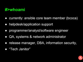 1) The document provides tips and tricks for using Ansible for tasks like automation, orchestration, and distributed batch execution across multiple hosts.