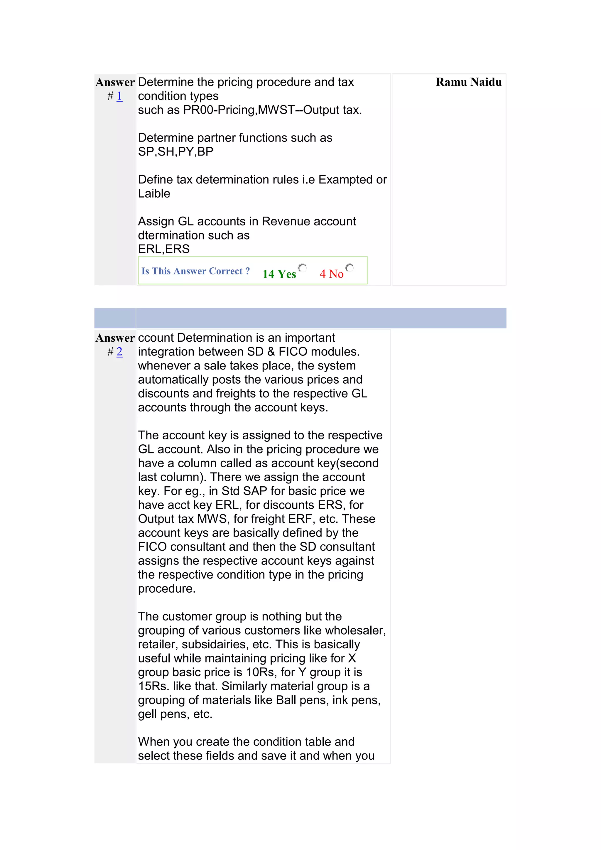 1. Account determination is the integration between SD and FICO modules that automatically posts prices, discounts, freight, and taxes to the appropriate GL accounts through account keys.
