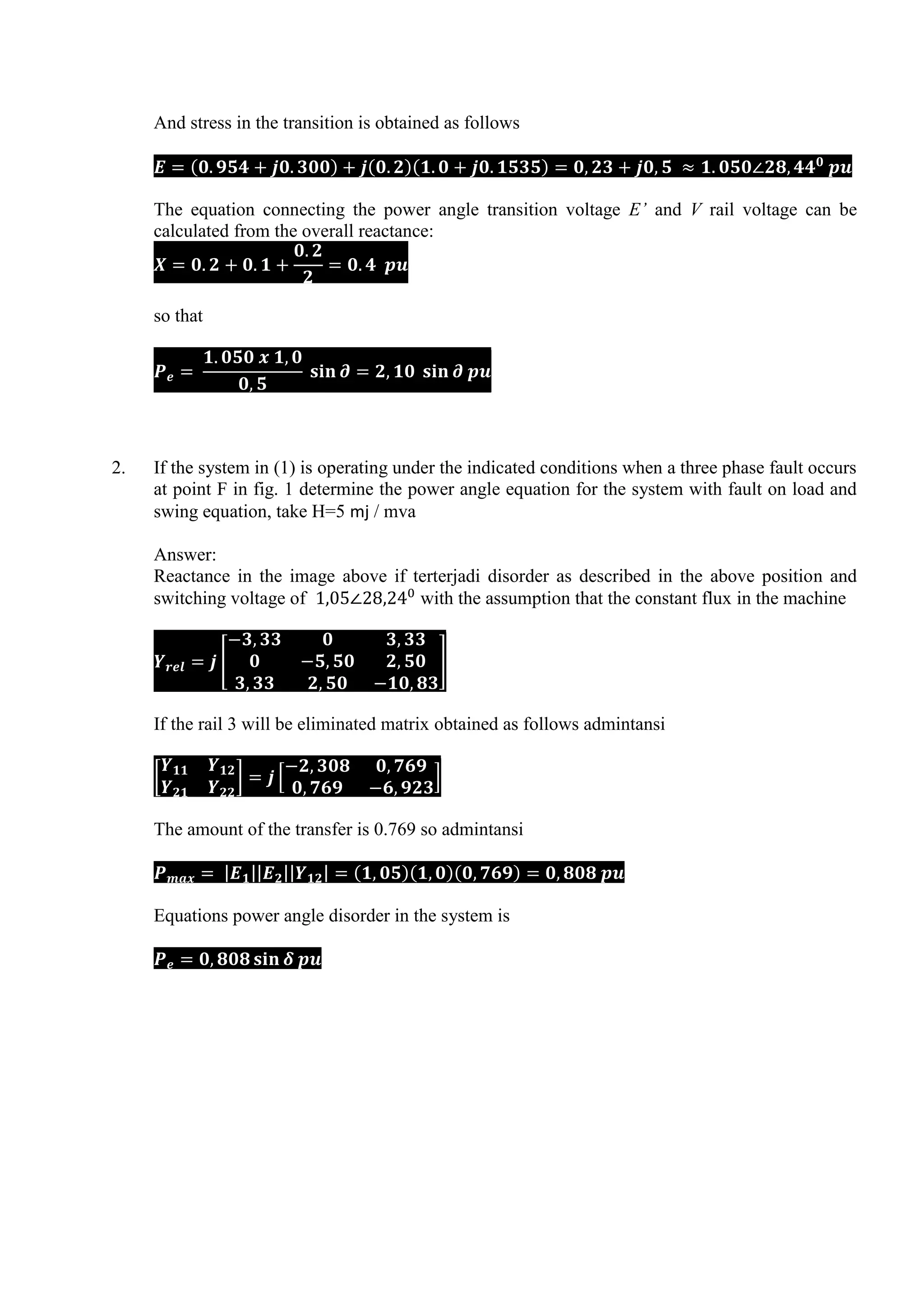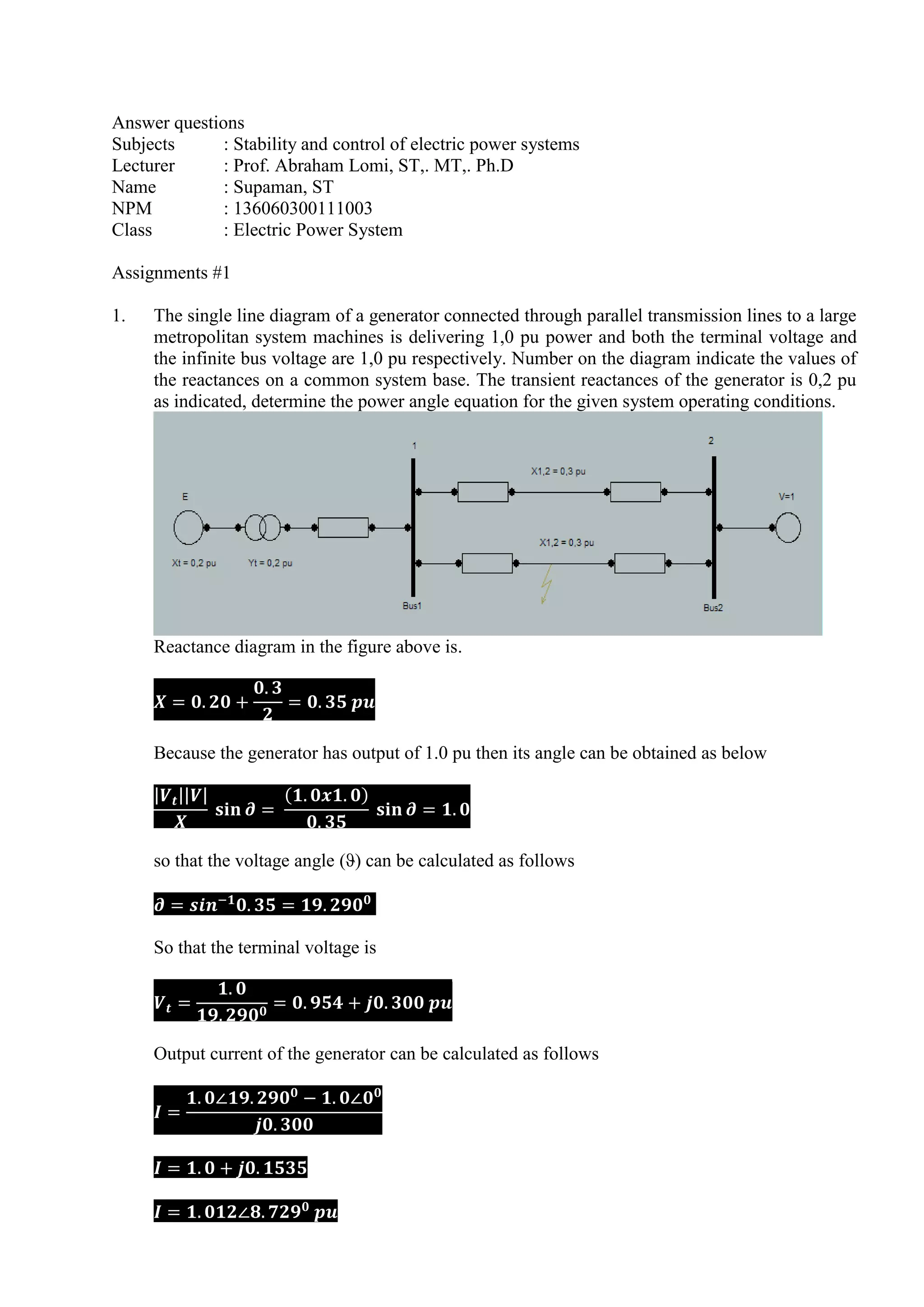 This document contains three assignments related to electric power systems. Assignment 1 contains two questions about determining power angle and swing equations for a generator connected to an infinite bus system under normal and fault conditions. Assignment 2 contains two questions about calculating critical clearing angle and time for a generator delivering power to an infinite bus when a fault occurs. Assignment 3 defines group assignments where students are to write papers on topics related to power system stabilizers, PV and QV curves, and the effect of excitation systems.