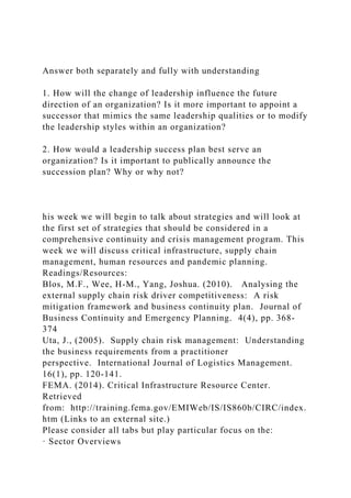 The document discusses the implications of leadership changes on organizational direction, emphasizing whether to replicate past leadership qualities or adapt new styles. It outlines the importance of leadership succession plans and the consideration of their public announcement. Additionally, the document introduces strategies for a comprehensive continuity and crisis management program, focusing on areas like critical infrastructure, supply chain management, and pandemic planning.