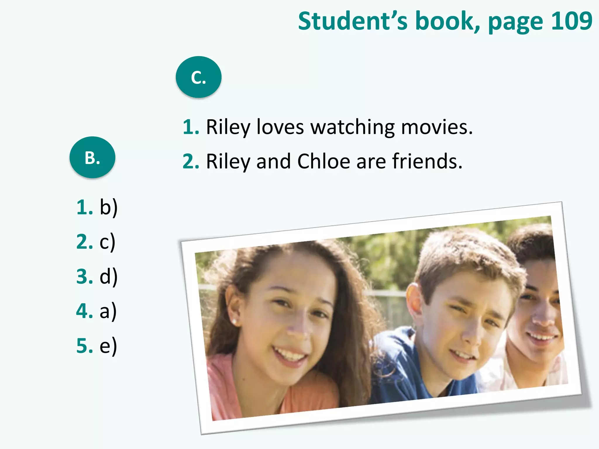 The document appears to be excerpts from a student's book containing various exercises. The first excerpt lists letter and number combinations, likely answering questions. The second excerpt lists activities that Riley enjoys like watching movies and things Riley and Chloe do together like being friends. The third excerpt lists hobbies and sports like listening to music, playing cards, and activities like rugby, tennis, video games and football.