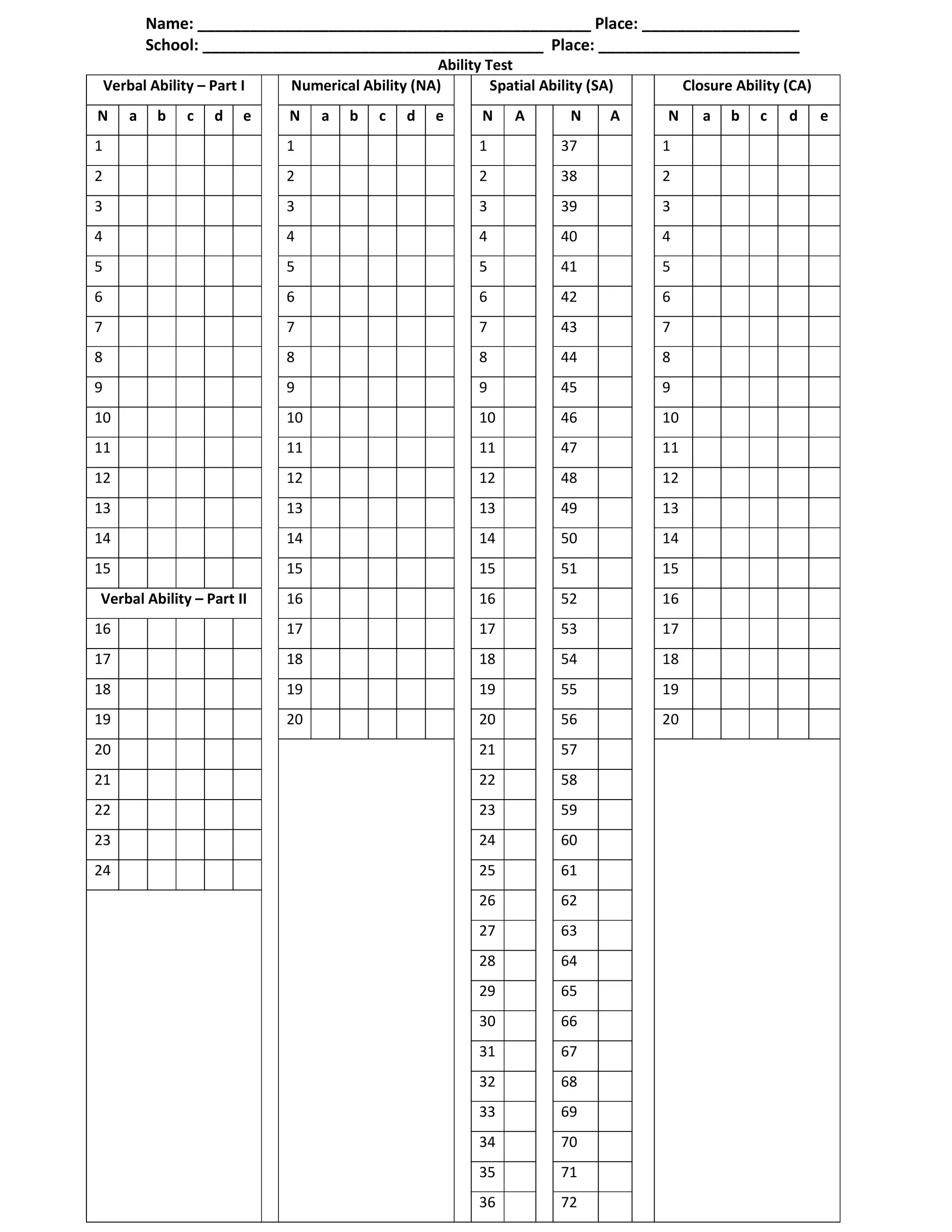 This document appears to contain the results of several ability, interest, and personality tests. It includes sections for testing verbal ability, numerical ability, spatial ability, closure ability, mechanical ability, clerical ability, reasoning ability, psycho-motor ability, and interest and personality inventories. The test sections include multiple choice questions with lettered responses for the examinee to select. The final sections are for scoring and rating the test results.
