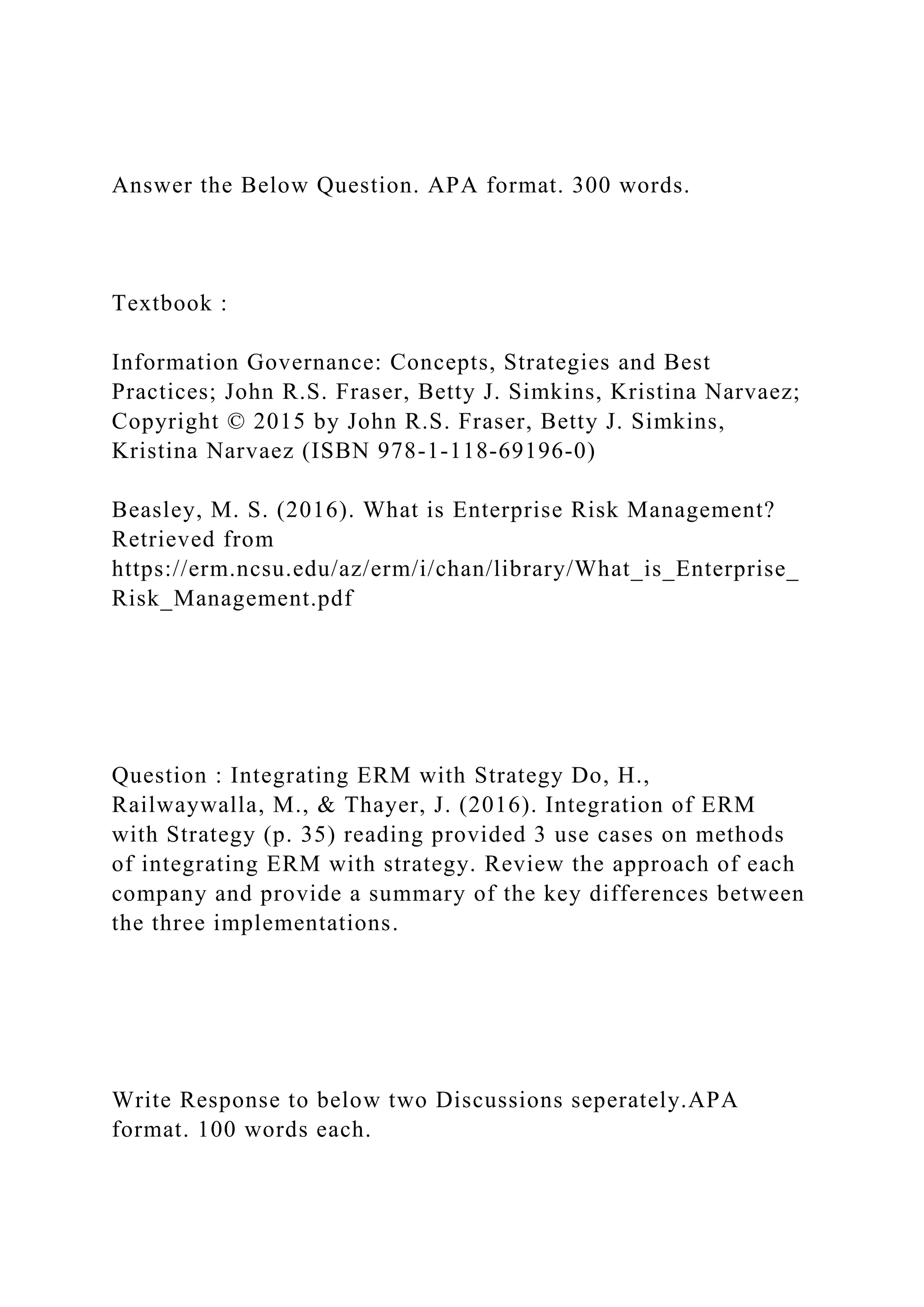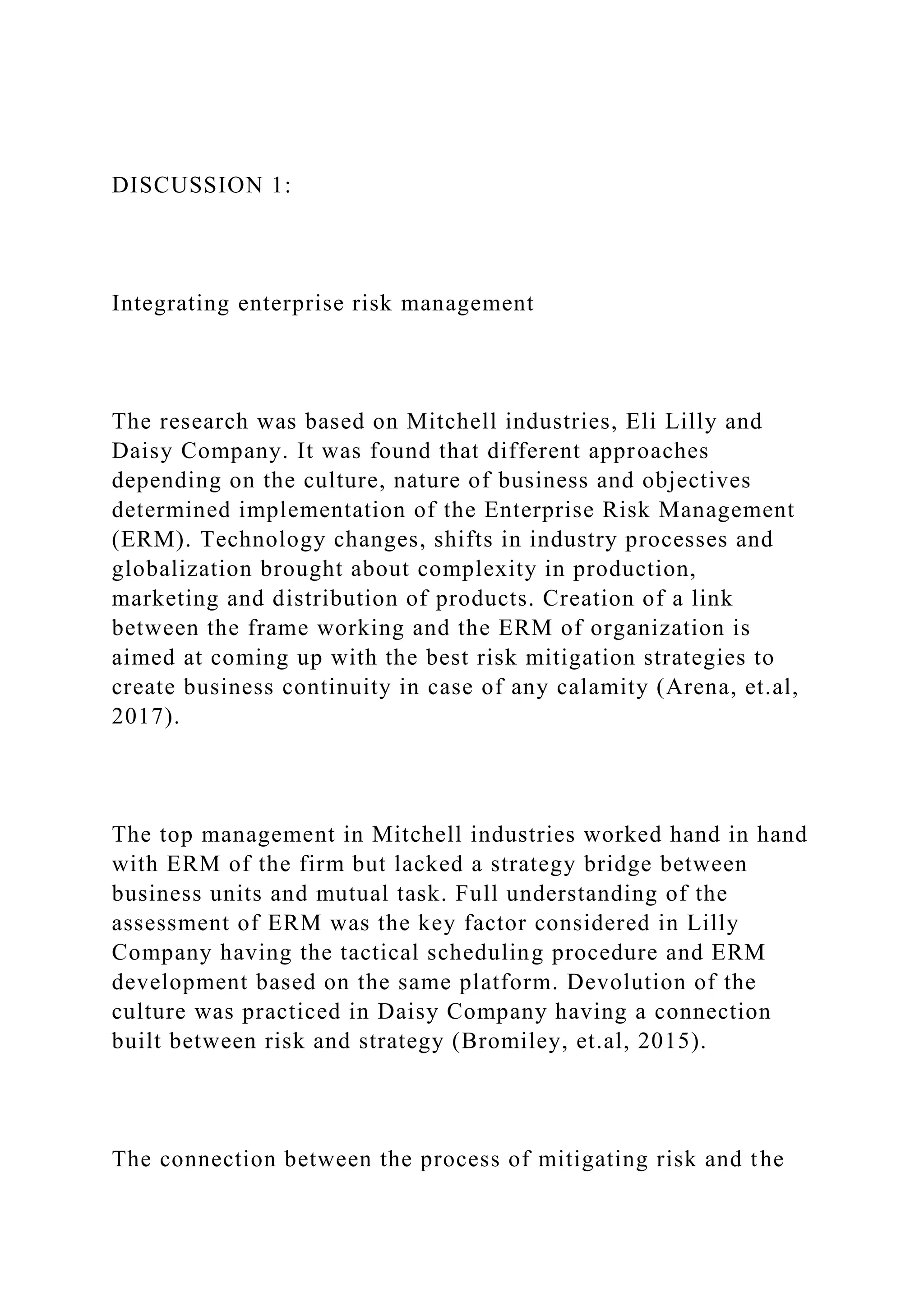 The document outlines an assignment that requires a 300-word response on integrating Enterprise Risk Management (ERM) with business strategy, utilizing a textbook and a study with three case companies: Mitchell Industries, Eli Lilly, and Daisy Company. It discusses the variations in ERM implementation among these companies based on their culture, objectives, and management approaches, highlighting how each company's unique context influenced their strategies. Additionally, it provides specific guidelines on writing two discussions in APA format, each to be approximately 100 words, summarizing the key differences in ERM integration across the three companies.